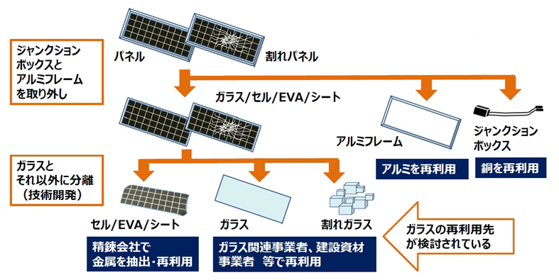 黒い部分からは再利用可能な金属が取り出され、ガラス部分も建築資材などとして再利用することが可能です。また、ジャンクションボックスもリサイクルされ、銅が再利用されます。